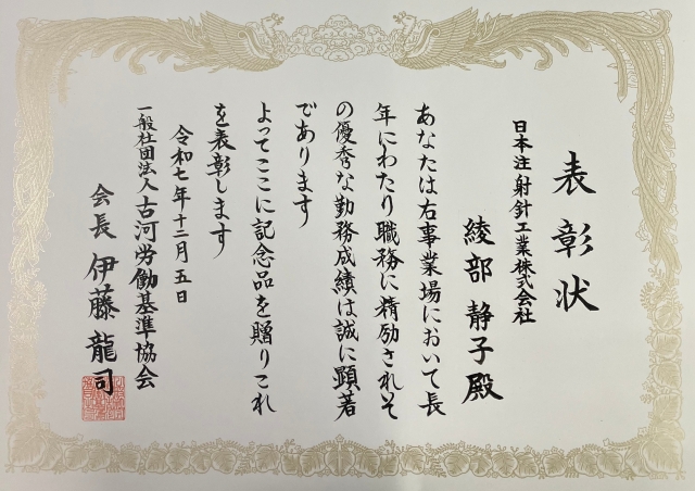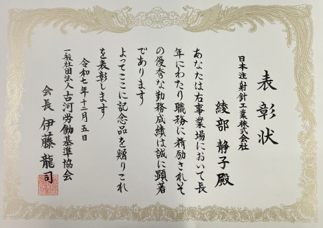 Shizuko Ayabe has won the Labor Standards Association Excellent Employees Award 2025.